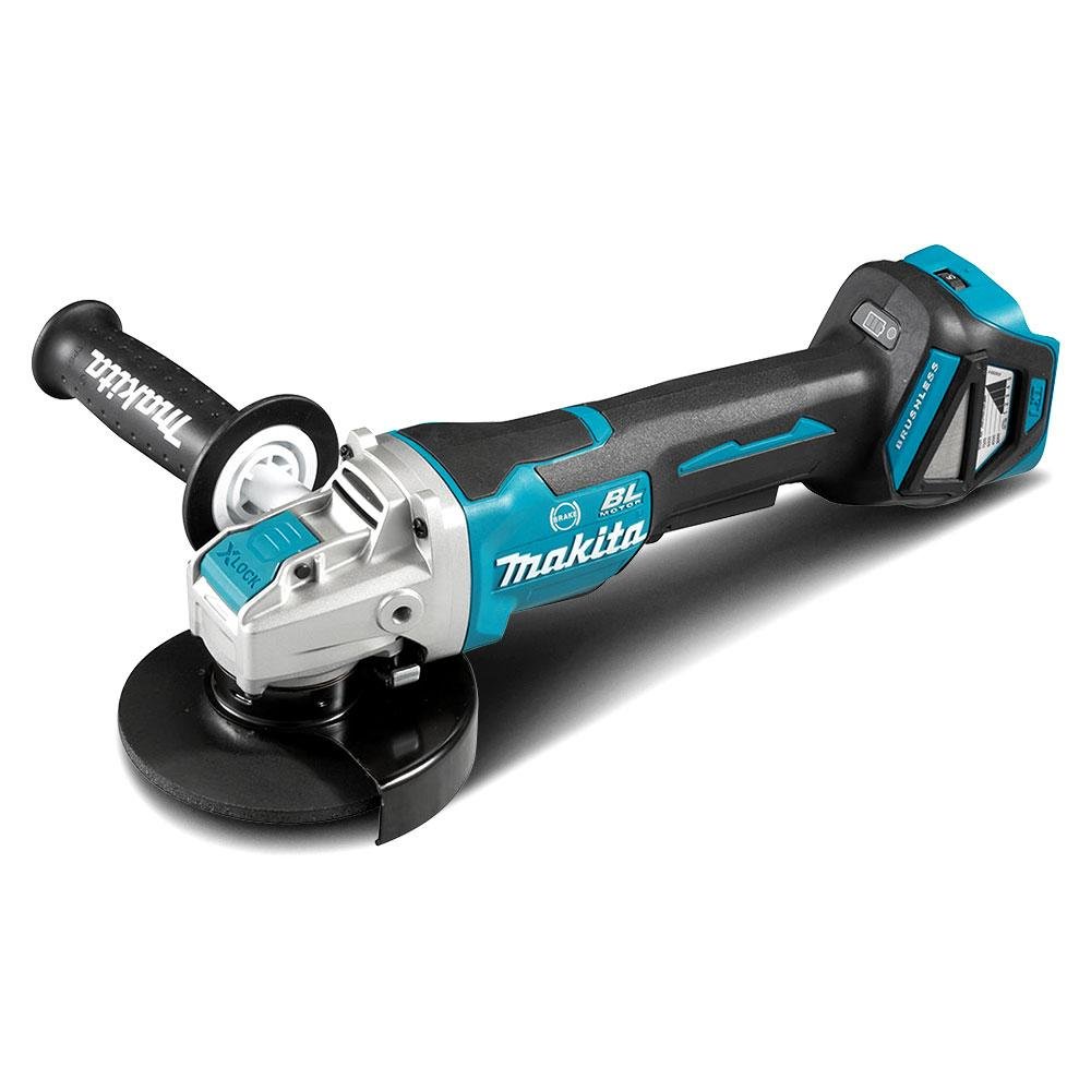 Батериска аголна брусилка со X-LOCK механизам за менување на дисковите без алат и автоматско менување на работната брзина во согласност со оптеретувањето. Има мерач за состојбата на батеријата и анти рестарт заштита.